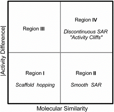 Figure 1 General form of the structure–activity similarity (SAS) maps showing four major regions. Regions I and II are associated with scaffold hopping and smooth SAR, respectively. Region IV indicates discontinuous SAR and activity cliffs